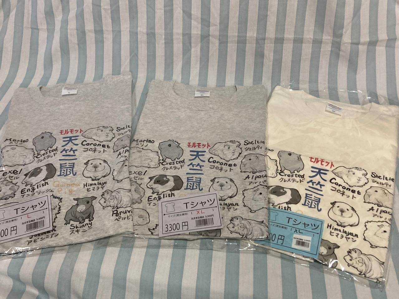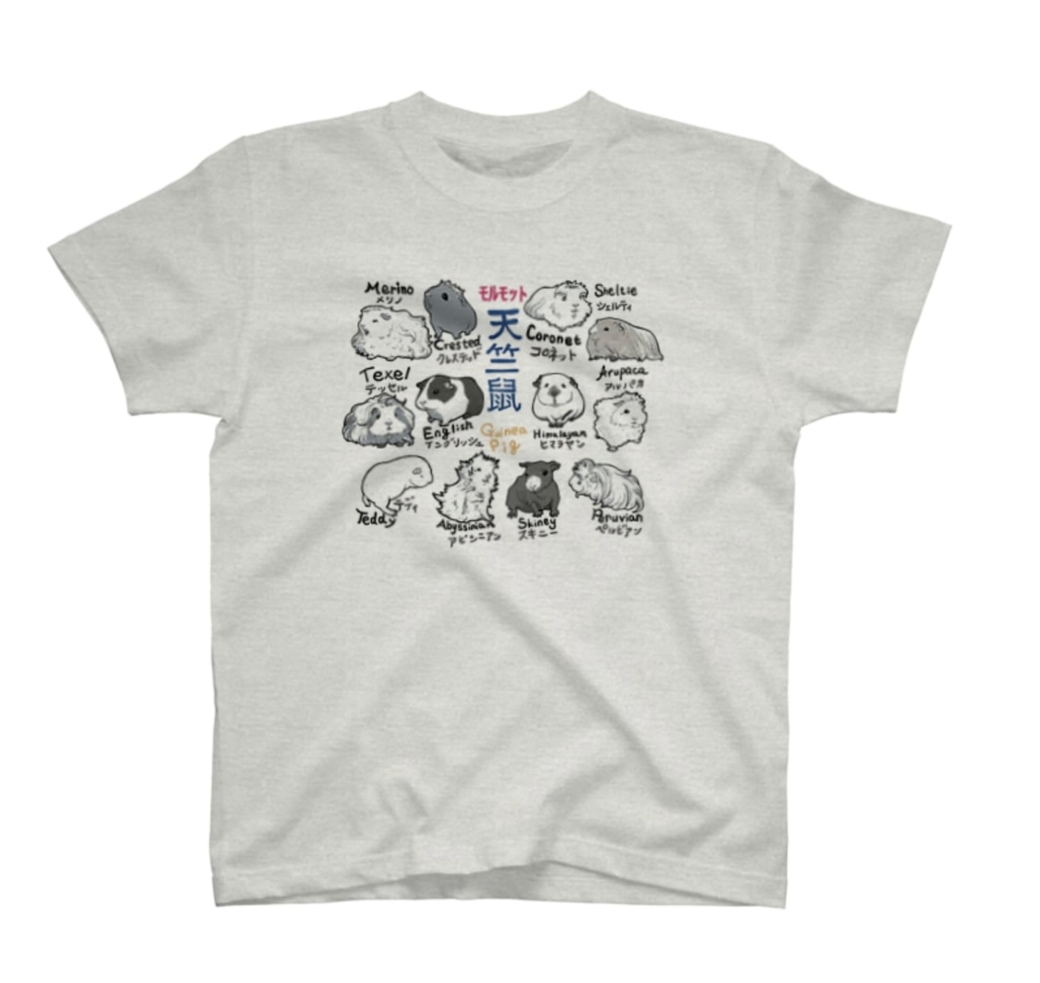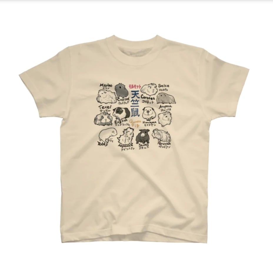 天竺鼠(モルモット)の品種が描かれたTシャツです